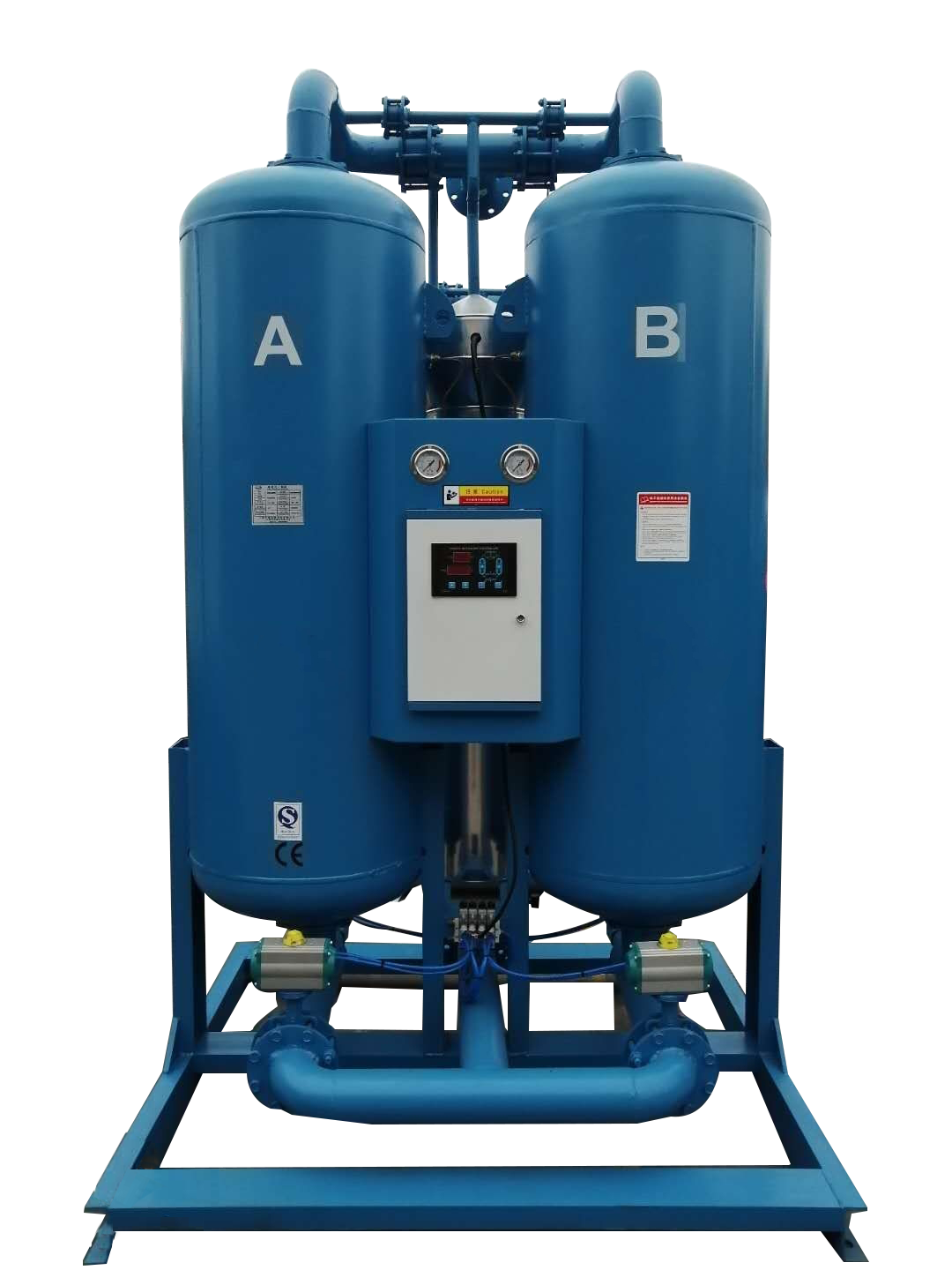 一、吸附式干燥機的操作面板說明:1、數碼管顯示窗:參數設置顯示及運行時間倒計時顯示。2、A塔吸附指示燈:指示A塔的吸附狀態。3、B塔吸附指示燈:指示B塔的吸附狀態。4、A塔再生...